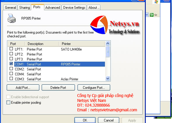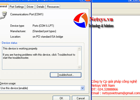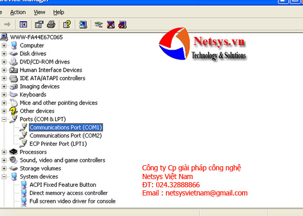 "Control Panel"——>"System"——>"Hardware"——>"Device Manager"——>"Ports(com &lpt)" ——> Communication Port(com1)hoặc Communication Port(com2)( Nếu cổng giao tiếp serail được kết nối với com1 của máy PC, sau đó nhấp vào Cổng giao tiếp(com1), hoặc chọn cổng giao tiếp(com2).